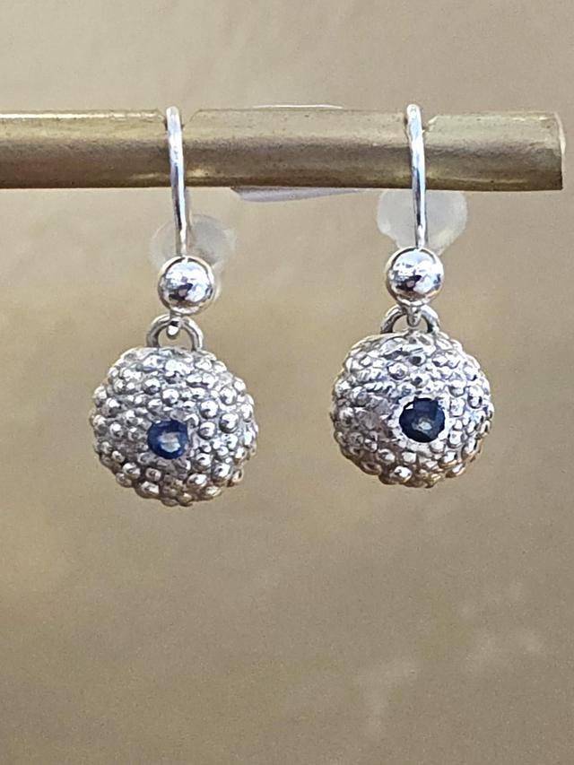 Boucles d'oreilles réalisées à partir dun vrai oursin de 8mm. L'oursin a été d'abord plaqué en cuivre par électrolyse puis moulé et coulé en métal : argent (boucles en argent et saphirs) ou laiton plaqué ensuite en or 18 carats de haute qualité (5 microns, contre 3 microns pour un placage basique). Le modèle en laiton plaqué or est serti d'émeraude de 2,5 mm.