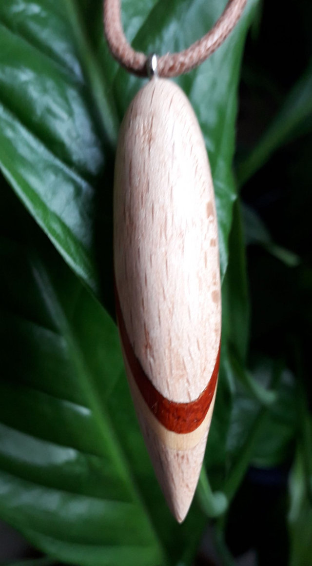 Dans la collection des "Griffes", je vous présente la "Griffe courbe" en bois de hêtre enlacée de courbes en padouk et buis. Lacet marron clair en coton ciré.